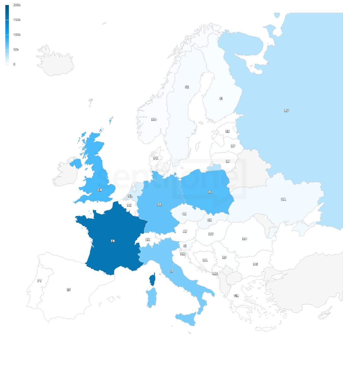Die Anzahl der Verweise auf #PyeongChang2018 in Europa. Je dunkler die Farbe blau, desto mehr Online-Aussagen wurden getätigt.