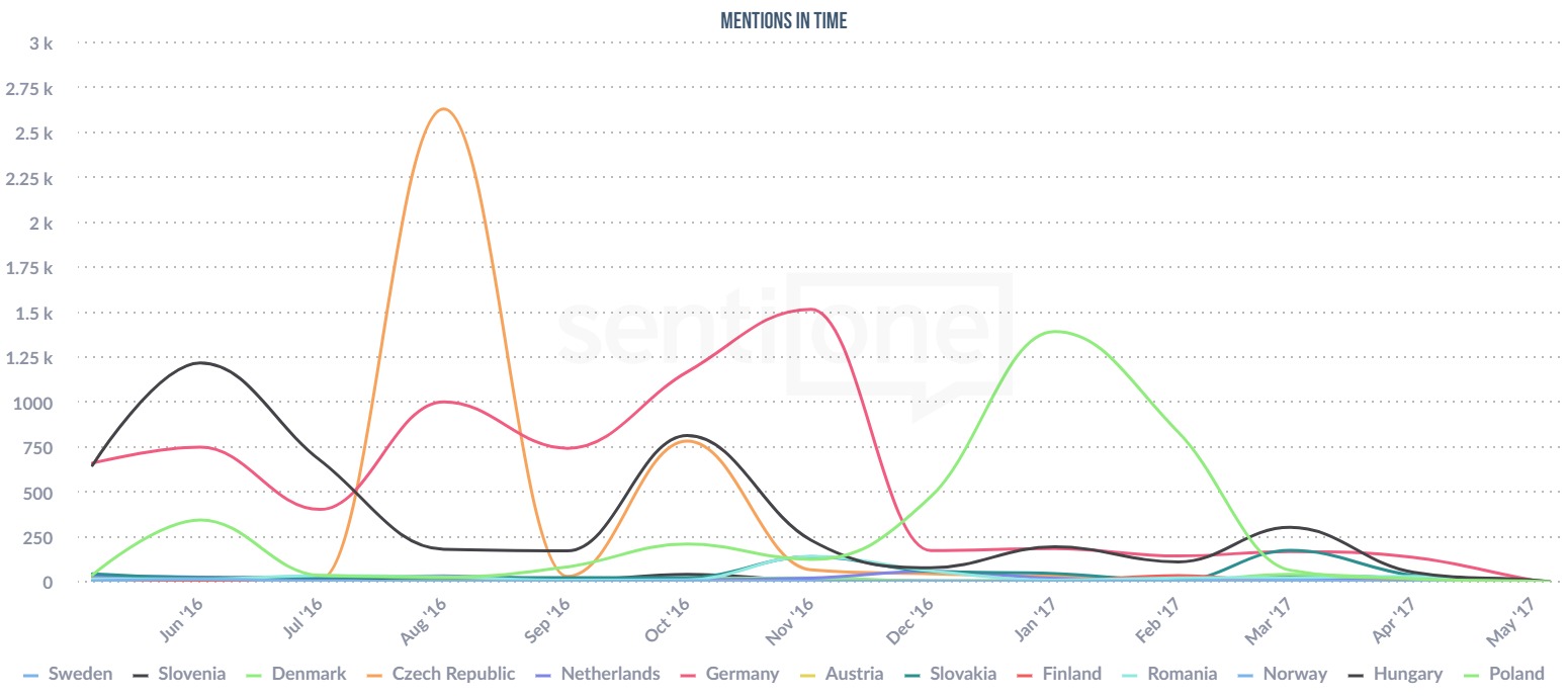 And, although every country has its own favorite brand based on the number of online mentions, the social media users seem to be not interested in these products in Sweden, Norway, Finland, Netherlands and Austria at all. That resulted in very low numbers throughout the year (eg. Finland – 316 mentions, Germany – 21 541 mentions).