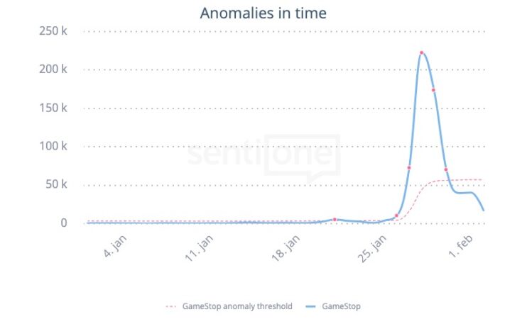Először nem is tudtuk mi történik, csak riasztást kaptunk arról, hogy a GameStop háza táján anomáliák jelentkeztek, azaz szignifikánsan több említés született a témáról egy adott időben mint átlagosan.