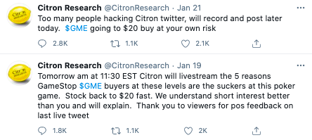 A Citron Research arról nyilatkozott, hogy a GME nem ér többet 20 dollárnál. (pedig akkor már stabilan 30 dollár volt)