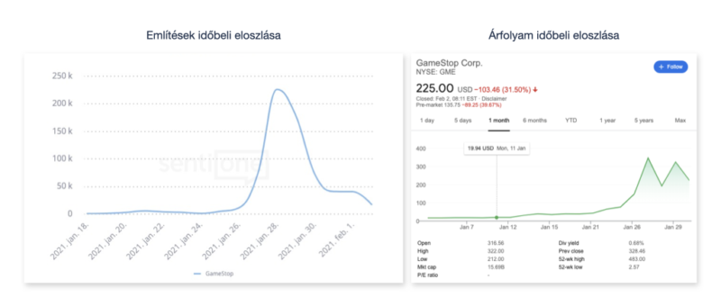 Nem meglepő, hogy az említések időbeli eloszlása és az árfolyam alakulása között hasonló ívet fedezhetünk fel, hiszen a chat szobás beszélgetések generálták a GME vásárlásokat.