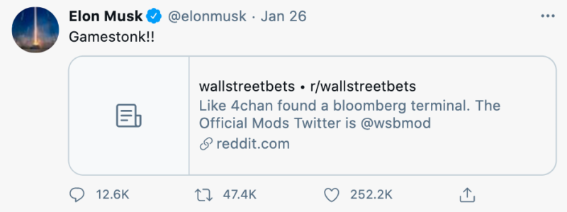A média fokozott figyelme csak még érdekesebbé tette a helyzetet. A lakossági befektetők is felfigyeltek a GameStop részvényeire és be is álltak a vásárlók sorába. Elon Musk egyszavas tweetje még magasabbra emelte a részvény árfolyamát. (Később tagadta, hogy lenne GameStop részvénye, csak véleményezte a tőzsdei helyzetet.)