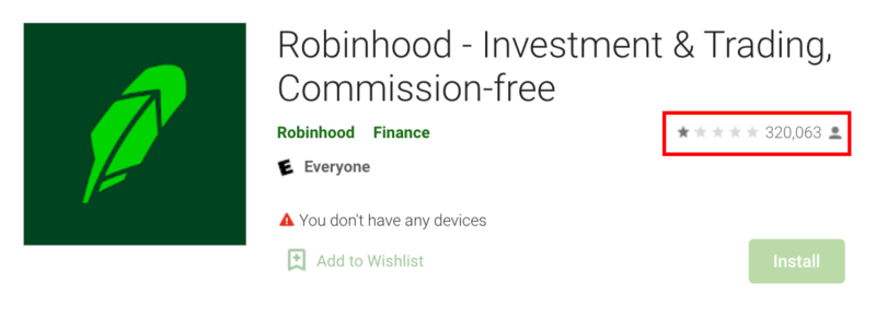 Azt gondolnánk, hogy ez a sztori már nem lehet érdekesebb. És akkor jöttek a brókercégek, akik saját döntésként vagy akár külső nyomásra, de bele tudnak avatkozni a tranzakciós folyamatokba. A Wall Street oldalára állva így tett a Robinhood applikáció, és letiltotta a GameStop részvények vásárlását és eladását. Mivel nem volt más eszköz a kezükben, a netezők kevesebb mint egy nap alatt 1.1-re döngölték a Robinhood applikáció netes értékelését.