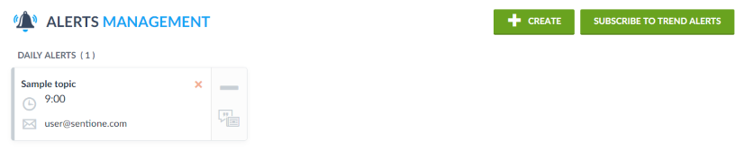 The module allows to set and edit email notices on new mentions in selected topics. SentiOne can send you regular or critical alerts if certain topic will have new mentions. By default daily periodic alert is added during the topic creation. However, you can add new alerts at any time. To do so, click 'Alerts' icon on the left menu. Next, click 'Create'.