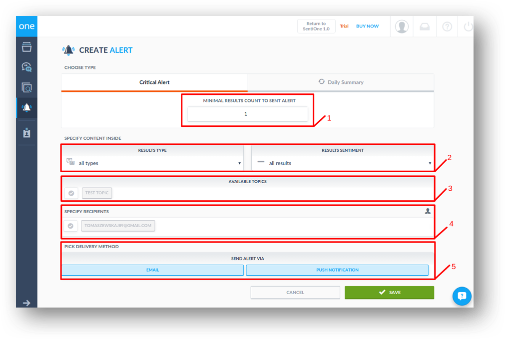 To set up a critical alert you should specify the minimum results count, results type (mention or article), results sentiment and which topic they should come from. You should also define recipients of certain alert and delivery method (email orpush notification). Critical Alerts are sent straight after collecting the required number of mentions in a topic.