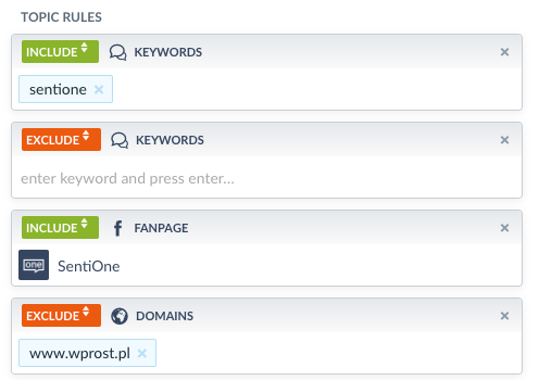 Following rules will create topic that: monitors SentiOne keyword, all posts on SentiOne fanpage and exclude all mentions published on the pointed source.