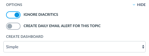 Additional options allow to ignore diacritical marks, set email alerts to a given topic and also to create a new dashboard.