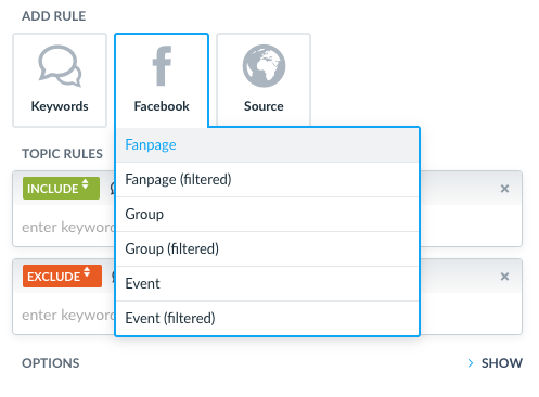 If you wish to retrieve only specific mentions from the fanpage, containing keywords you specified earlier – choose Fanpage (filtered) rule type.