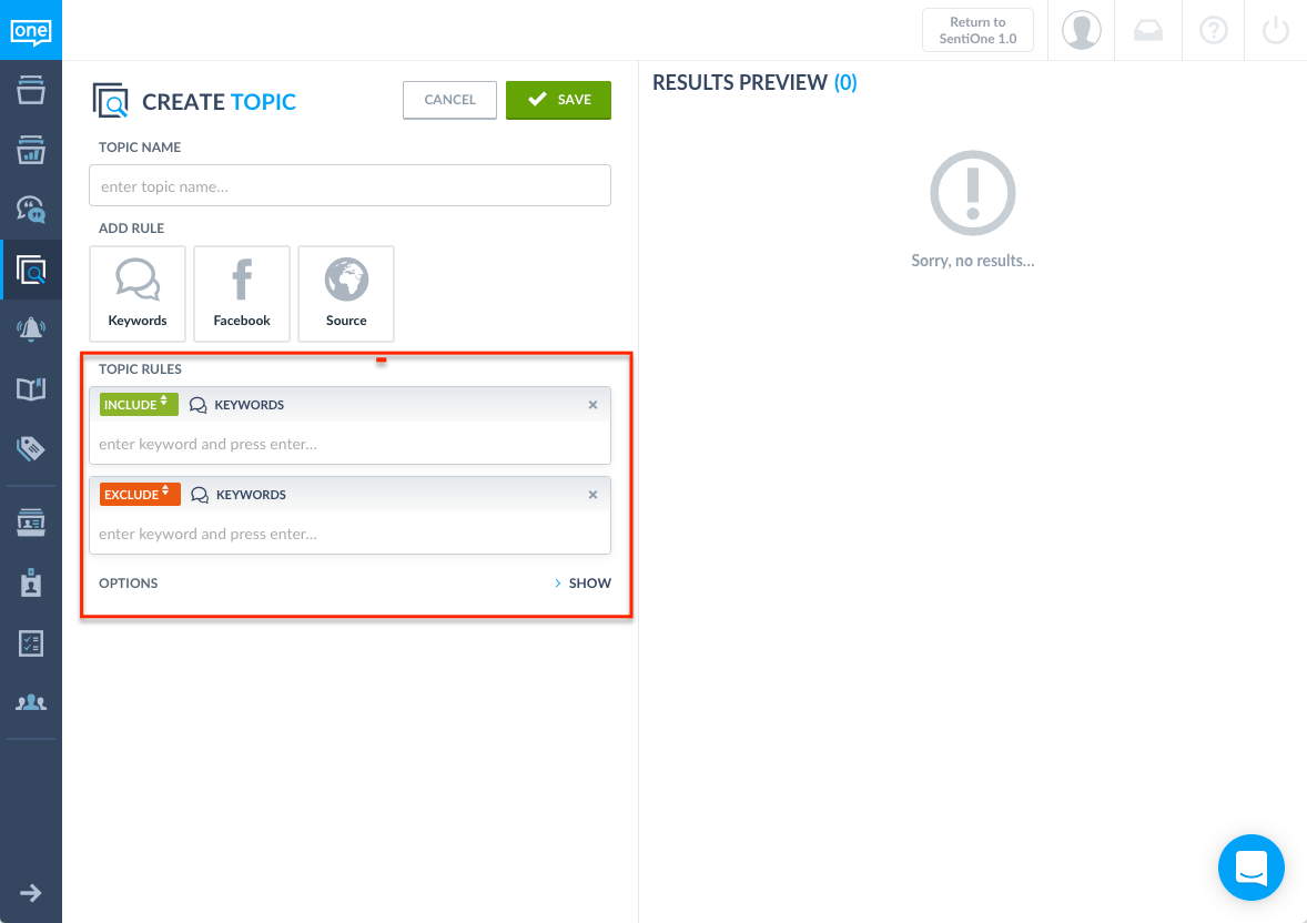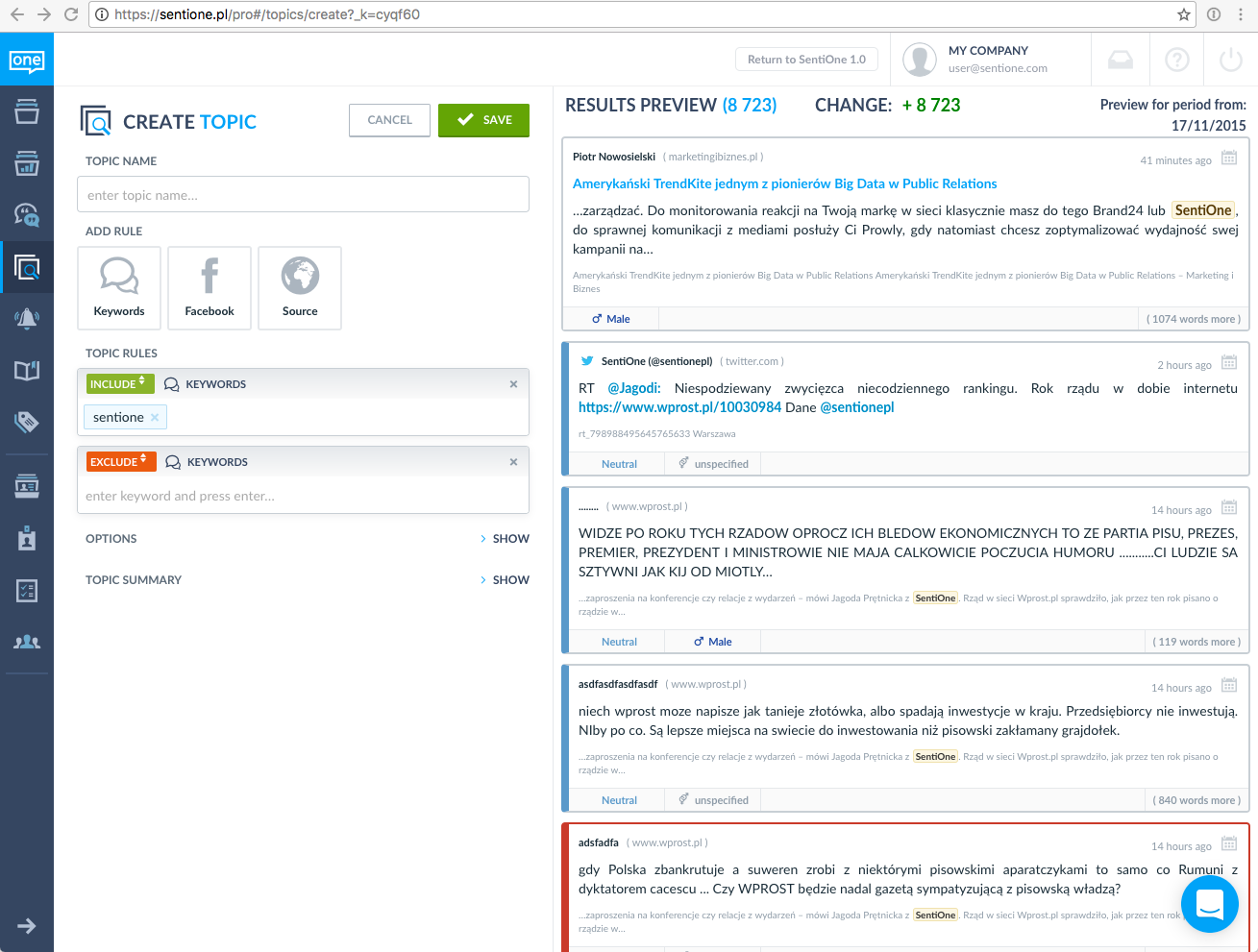 Topics, to put it simply, are search queries SentiOne uses to retrieve the mentions about your brand from our database. Topics consist of keywords and search rules you can set using our one-step topic creator.