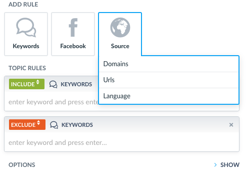 Similarily to Facebook based rules, you can filter mentions from any URL or domain. To do so, hover over Source rule in the creator, and choose: