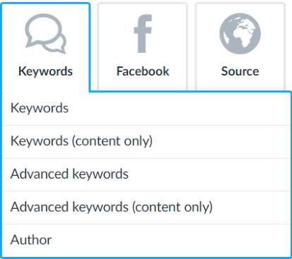 To use simple keywords, choose Keywords. In SentiOne, there are a lot of options to use keywords, including advanced options: