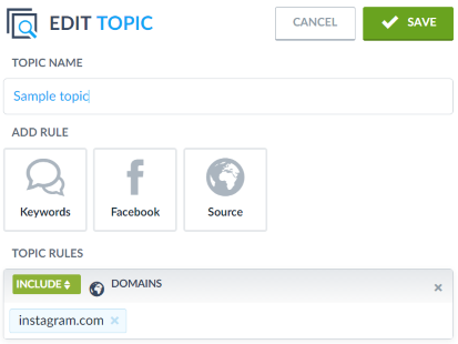 The topic is a set of keywords under which the system searches the internet. The topic may be, for example: the company, brand, product, person or even industry. Topic should contain the variety and different forms of keywords that define the particular matter.