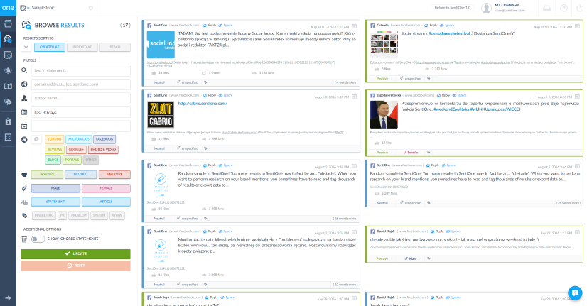 - Results sorting – allows to filter mentions by publication date, indexation in the SentiOne system or the reach of statements. You can sort mentions increasingly or decreasingly within each of these categories.