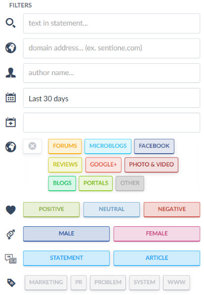 You can filter mentions simply by entering a keyword they should contain or domain they should appear on in proper form. You can also filter mentions posted by a certain autor only or mentions published within certain time frame.