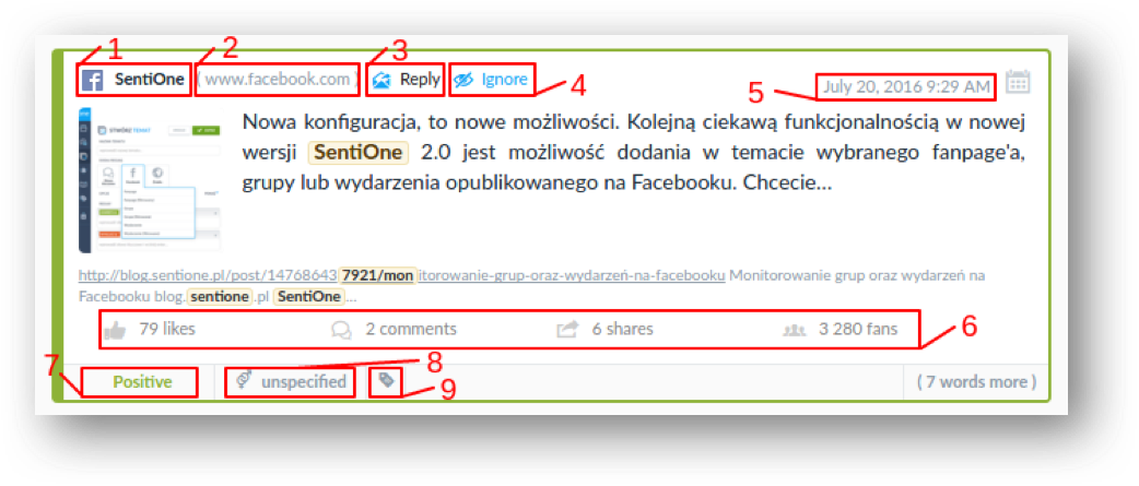 - Information regarding number of followers – data placed here depends on the type of source: Facebook (number of shares, likes, comments), Twitter (number of people observing account, likes, retweets), YouTube (number of likes, dislikes, displays), Instagram (number of likes, comments), Wykop (number of likes or shares, comments).
