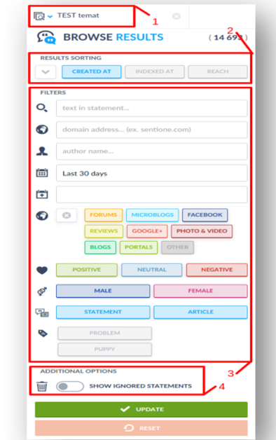 You may combine multiple filters to narrow your results. After applying filters you should always click 'Update' button to refresh the list of mentions.