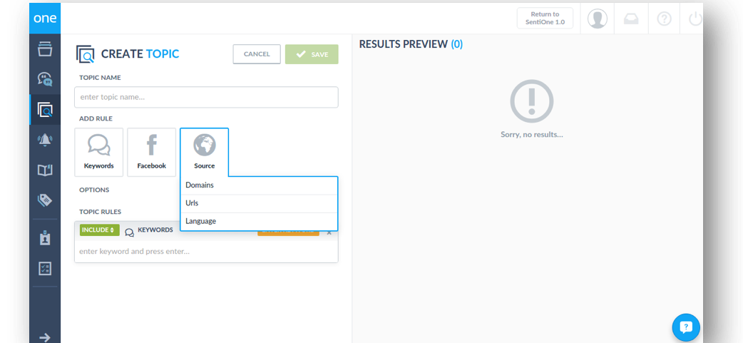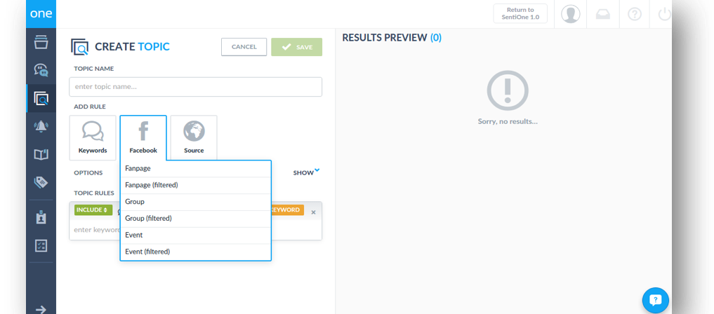 Example: The set-up below means that on the basis of the keyword sentione* all mentions from the entire web containing the keyword are collected (also in context, because the keyword is not narrowed to content). Additionally, thanks to the fanpage we will receive all mentions coming from the SentiOne fanpage on Facebook (also those not containing keywords).