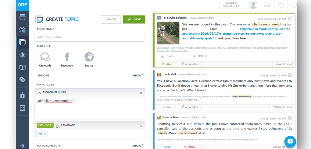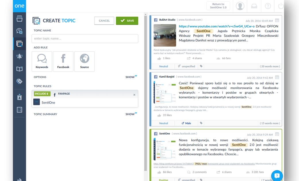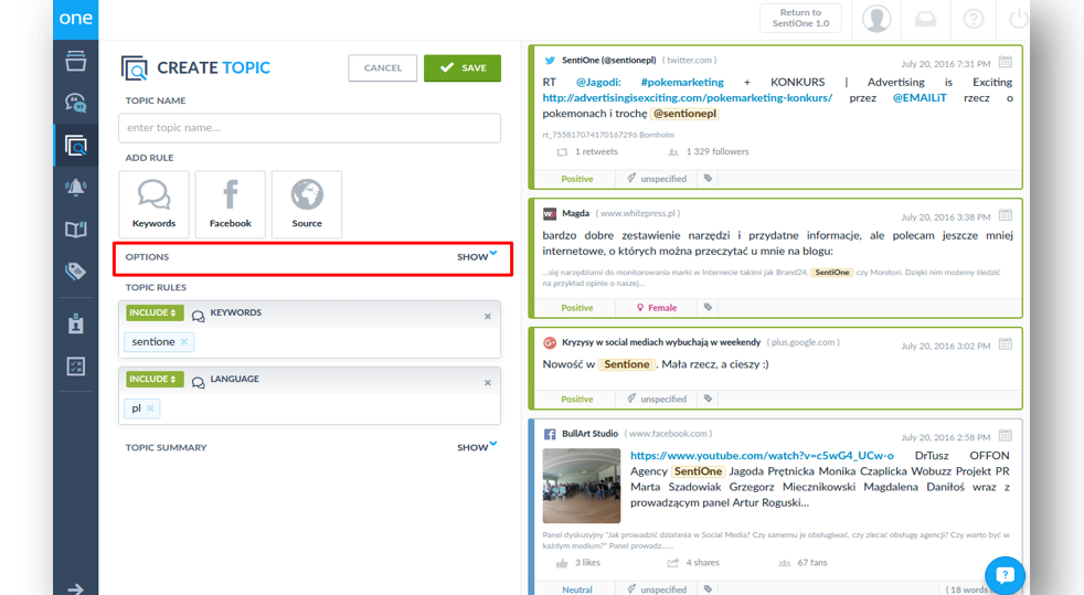 Typed keywords will be searched in content, authors and in context (e.g. if under a post on Facebook, in which keywords appear, there are comments which do not contain them, they will appear in a statement the profile SentiOne).