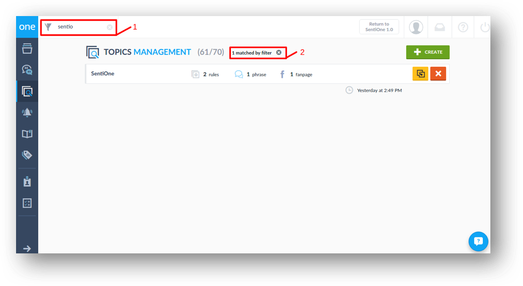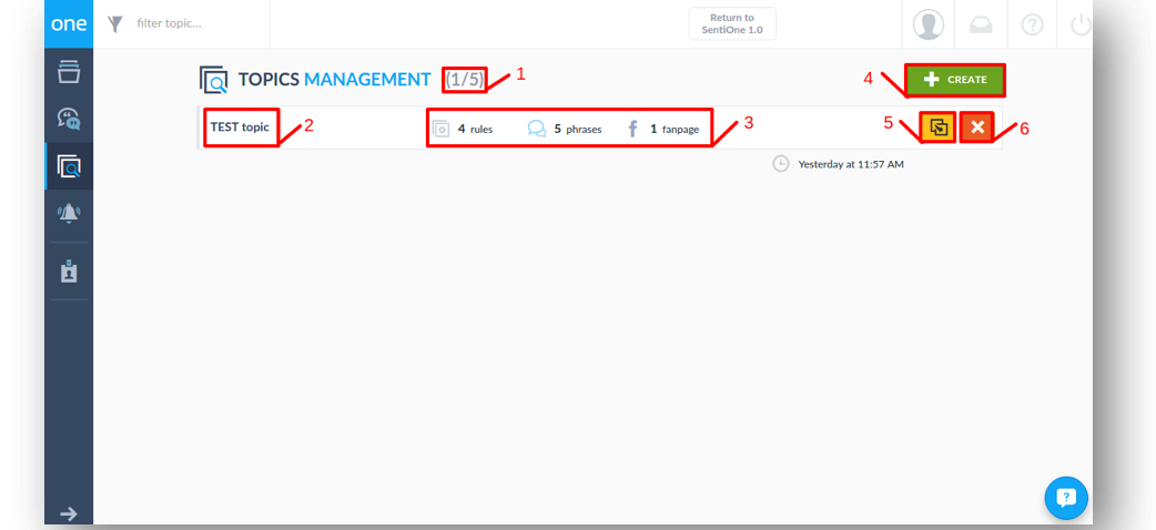 In order to go to the topics creator, you should click on “+CREATE” in the Topics module. It is also possible to move to editing the already existing topic or duplicate it.