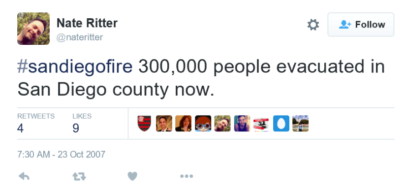 Ale prawdziwie społecznego wymiaru nadał mu kilka miesięcy później ogromny pożar w San Diego, kiedy to internauci zaczęli posługiwać się oznaczeniem #sandiegofire.