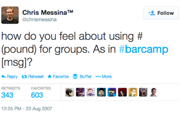 Znak # początkowo służył w internecie do oznaczania konkretnych słów, o specjalnym znaczeniu. Początki masowego użycia tego symbolu sięgają lat 70. (!),kiedy to stosowano go do określania grup i katalogowania tematów w komunikatorze IRC. Wraz z końcem popularności narzędzia, umarł także hashtag i to na długie lata. W 2007 roku wskrzesił go pracownik Google, Chris Messina, zadając na twitterze pytanie "Co myślicie o użyciu # dla grupowania dyskusji?".