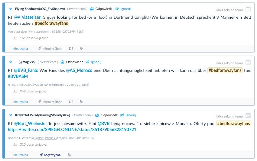 Informacja o ataku zszokowała Europę około 20.00. Chwilę po ogłoszeniu przełożenia meczu na następny dzień powstał hashtag #bedforawayfans, pod którym kibice Borussi proponowali nocleg wszystkim tym, którzy przyjechali na to spotkanie i nie planowali pozostać w mieście na dłużej. Tylko do 21.00 hashtagu użyto przy 3 tysiącach wzmianek, do końca dnia - aż 20 tysięcy razy!