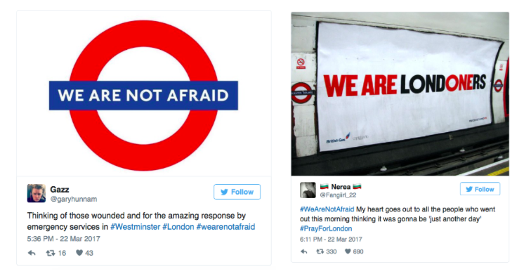 #Wearenotafraid #LondonStrong - te dwa hashtagi powstały tuż po niedawnym zamachu w Londynie, do którego doszło 22 marca. Zgodnie z całym medialnym przekazem i oficjalnym stanowiskiem władz Anglii miały one pokazać, że Londyńczycy nie dadzą się zastraszyć i nie pozwolą, aby akty terroru wpłynęły na ich codzienne życie. Przy jego użyciu internauci udostępniali głównie zdjęcia i krótkie posty na twitterze: