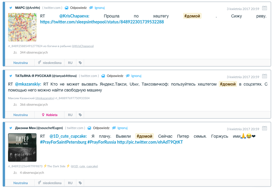 Podobna akcja zawiązała się podczas zamachów w Sankt Petersburgu, kiedy to sparaliżowane zostało całe metro, będące głównym środkiem transportu w mieście. Rosyjscy internauci momentalnie stworzyli hashatagi #везу i #домой - czyli #zawiozę i #dodomu, dzięki którym pomagali sobie nawzajem bezpiecznie wrócić do miejsca zamieszkania. 3 i 4 kwietnia hashtagi te użyte zostały ponad 8 tysięcy razy, a z opłat za przejazdy zrezygnowali kierowcy Ubera i kilku korporacji taksówkarskich.