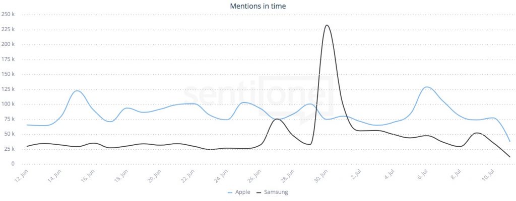 Mentions in time, Apple vs Samsung. Source: SentiOne