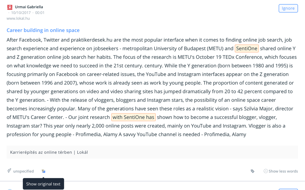 Rádi bychom vám připomněli, že SentiOne může monitorovat zmínky napsané v několika jazycích. Pokud váháte, zdali používat multimarket dashboardy, protože neznáte ostatní jazyky, jednoduše vyzkoušejte funkci překladače.
