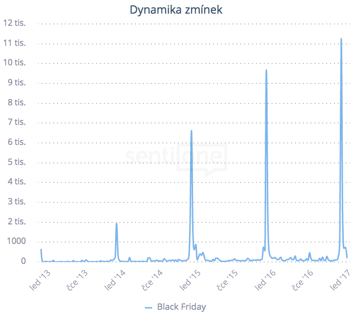 To, že přebíráme americké zvyklosti jako na běžícím páse, už není žádnou novinkou a stejně tak to platí u Black Friday. Každým rokem je v Česku tento den nabitý slevami více a více populární, což dokazuje i následující graf. Od roku 2013 konverzace na téma Black Friday razantně eskalují a v minulém roce dosáhlo toto období plné shoppingu až 11 tisíc zmínek.