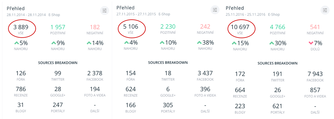 Avšak typické hodinové stání ve frontě před obchodem je naopak rok od roku na ústupu. Může za to jak jinak, nežli digitální doba, která umožňuje mnohem pohodlnější způsob nákupu. Stačí se jenom usadit k počítači, tabletu nebo vytáhnout z kapsy telefon a nakoupeno máme za pár sekund a prokliků. E-shopy zažívají boom a u Black Friday to platí dvojnásob. Doslova. Když porovnáme počet zmínek z posledních třech let na téma E-Shopy, vidíme, že v roce 2016 vzrostl oproti roku 2015 dvojnásobně.