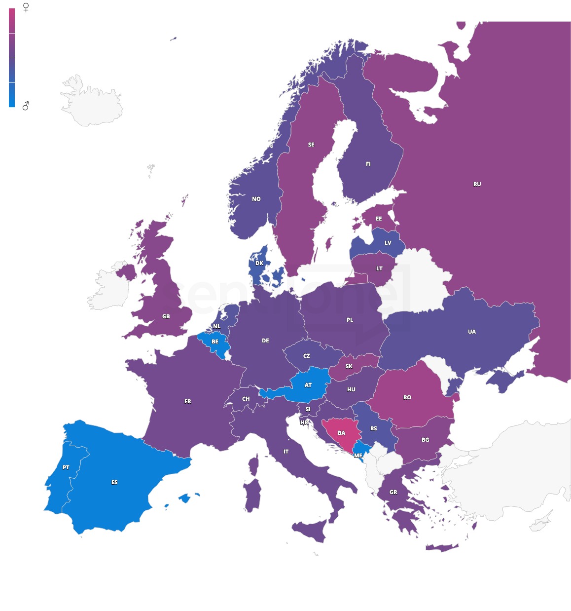 Die Geschlechteranalyse zeigt, dass vor allem Frauen aus Bosnien und Herzegowina, Rumänien und Russland ein gesteigertes Interesse an den olympischen Spielen haben.