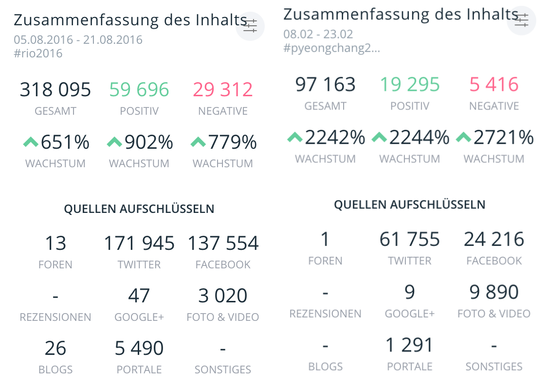 Dank des Zugriffs auf historische Daten (bis zu 36 Monaten in die Vergangenheit) kann man mit Hilfe von SentiOne ganz einfach die Sommerspiele 2016 von Rio mit den Winterspielen in Pyeongchang vergleichen. Die Analyse zeigt, dass die Wettkämpfe in Brasilien ein deutlich größeres Interesse bei den deutschen Internet-Usern hervorgerufen haben.