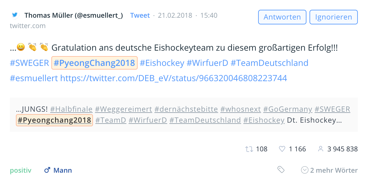 Die meisten Online-Äußerungen gab es bis jetzt, als die deutsche Eishockeymannschaft überraschend Schweden geschlagen hat und damit ins Halbfinale eingezogen ist. So könnte es sein, dass Deutschland als krasser Außenseiter erstmals seit 42 Jahren hier wieder eine Medaille holt. Die größte Reichweite zum Thema Halbfinaleinzug hatte der Tweed von Fußballprofi Thomas Müller vom FC Bayern München. Er erreichte mit seinen Glückwünschen fast 4 Millionen Menschen. Außerdem wurde sein Beitrag über 100 mal geteilt und von fast 1200 Leuten geliked.