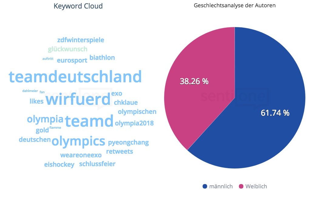 In Deutschland dagegen sprechen online mehr Männer über das Ereignis. Die Keyword Cloud zeigt die Wörter an, die am häufigsten mit #PyeongChang2018 erwähnt wurden. Sieht man genau hin, so erkennt man den Namen einer Sportlerin: Laura Dahlmeier. Die deutsche Biathlon-Königin holte bereits zwei Goldmedaillen und ist jetzt schon ein gefeierter Star in ihrer Heimat.