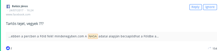 Mindemellett a felületen beállíthatsz egy ‘Alert’ funkciót is. Miért tennél ilyet? Mert, ha hirtelen megugrik a negatív, a márkádhoz kapcsolódó említések száma, akkor azonnal értesít a rendszer. Az adatokból kreált grafikonjaink interaktívak: azaz a képbe kattintva visszavisznek az aznapi konkrét bejegyzésekhez. Troll vagy nem troll? Kamu vagy nem kamu? Krízishelyzet vagy nem krízishelyzet? Azonnal kiderül, ha elolvasod a bejegyzéseket.