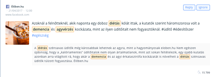 Néhány nap leforgása alatt több mint 50 online weboldal vette át/közölte le az anyagot, köztük a szeretlekmagyarorszag.hu, a divany.hu, az index.hu és még sokan mások. Végül adásba is került a hír a TV2 Tények című műsorában. A kutatást amerikai tudósok végezték, ahova a legtöbb oldal át is linkelt, vagy legalább lehivatkozta. Ugyanakkor. Ha már az indexnél veszed észre, hogy valami van, akkor késésben vagy. A social listeningen keresztül bármilyen szót, kifejezést monitorozni tudsz. Coca-Colaként például a fogyókúra, a cukorbetegség, a diéta, az agyvérzés, a fogszuvasodás vagy épp egyszerűen csak a mellékhatások kulcsszó nagyon is fontos lehet a márkát körbeölelő online kommunikáció esetében. Kifejezetten előny, hogy mindezt lehet kizárólag csak a márka, a szénsavas üdítők vagy épp a diétás üditők kontextusában vizsgálni. Így csak akkor kapsz értesítést, ha számodra releváns kontextusban jelennek meg a monitorozott kifejezések.