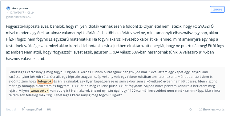 Ami mégi érdekesebb, hogy a témában rendszeres kommunikáló Facebook csatornák mellett – sőt, sok esetben helyett -, itt jelentős mennyiségben RELEVÁNS fogyasztói insight jelenik meg. Az elmúlt 3 hónapban közel 150, a fogyókúrához kapcsolódó párbeszéd zajlott le itt.