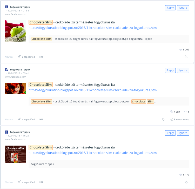 Ezt az oldalt említettük már korábban is. Az elmúlt másfél évben az itt közzétett 1437 poszt közel ötöde (!) a Chocolate Slim italt reklámozta… Sőt, az elmúlt 3 hónap tartalmait vizsgálva is ez a legnépszerűbb poszt az oldalon (a legnagyobb elérésű). Ezt szorosan és azonnal követi a: “Ránctalanitó és fiatalító csodaszer – Goji cream. 10 nap után, már ~5 évet fiatalít.…” című bejegyzés.