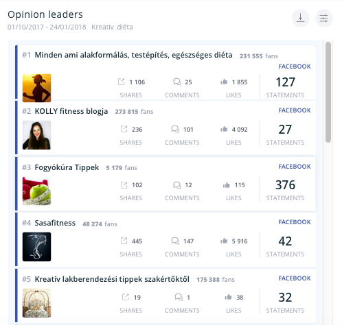 Ez annyit jelent, hogy ők voltak azok a publikus egyéni online felhasználók, oldalak, akik a témában a legnagyobb hangadók voltak – adott időszakban. A SentiOne ezt a rangsort automatikusan, egy saját fejlesztésű algoritmus segítségével állítja fel összevetve a felhasználók által közzétett, a kutatás kapcsán releváns tartalmak mennyiségét, az ezekre érkezett megosztások, kommentek és lájkok számával, valamint az oldal követőbázisának nagyságával.