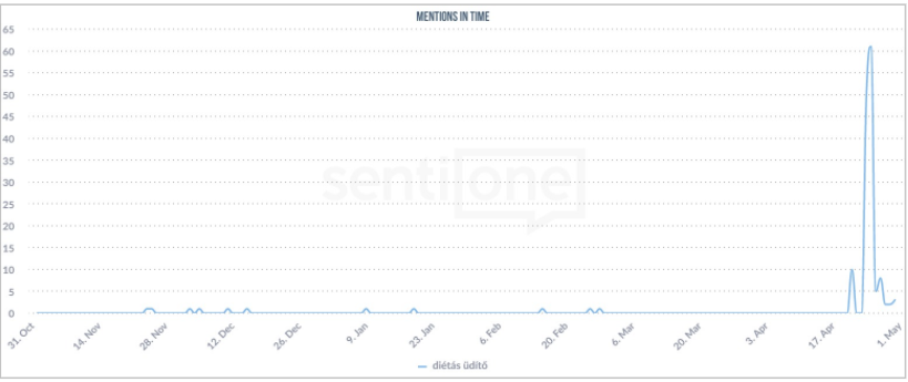 Két nappal később ugyanakkor már a Life.hu és a National Geographic magyar weboldala is erről a témáról cikkezett. Az összesen áprilisban megjelent 51, témához köthető cikk közül 22 kezdőképén ráadásul a kólát mutatják. Azaz, rögtön márkához társítják a fenyegető érzést. Az alábbi ábra az elmúlt egy év olyan online bejegyzéseit mutatja, amelyekben a diétás üdítők fogyasztását a stroke előfordulásának esélyével hozták párhuzamba. Jól látszik, hogy korábban nem volt szó erről online. Azaz viszonylag nehéz lett volna előrejelezni ennek felbukkanását, mindamellett, hogy diétás üdítőket előszeretettel kortyolgató emberként vagy épp ilyen termékeket gyártó cégként nagyon is fontos lenne, hogy ezeket a cikkeket azonnal lássuk, megértsük, véleményezzük vagy épp álláspontot foglaljunk.