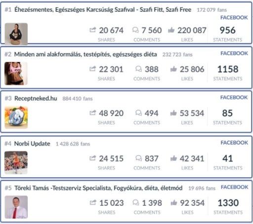 Csak a mintaként szolgáló tartalmak között közel 400 (!!!) különböző diétás tippet, módszert találtunk áprilisban – amelyek sport nélkül ígérnek (brit) tudósok által igazolt azonnali fogyást. Kezdve a fogyókúrát támogató karkötőktől egészen a 60 percig tartó nyalókáig, ami már 2016. augusztusa óta nagyon trendi téma. Emellett 137 különböző receptre és 234 márkahirdetésre bukkantunk. Utóbbiak szinte kivétel nélkül különböző fehérjeporokat vagy épp proteines termékeket népszerűsítettek.