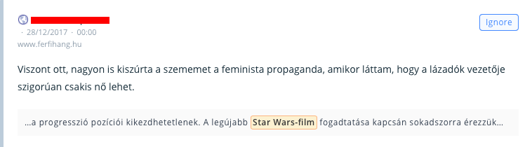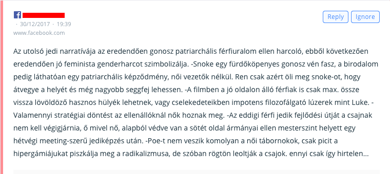Social listening kutatásunk során az összes olyan, publikusan és magyar nyelven a Facebookon és a különböző fórumokon közzétett felhasználói kommentet, tartalmat és posztot elemeztük, amit a Star Wars VIII: Az Utolsó Jedik szereplőivel kapcsolatban tettek közzé. Egy galaktikus (európai) riport keretében pedig ráeresztettük szoftverüket Európára is – itt már a teljes internetes palettával dolgoztunk: Facebook, Twitter, YouTube, Instagram, blogok, fórumok, weboldalak.