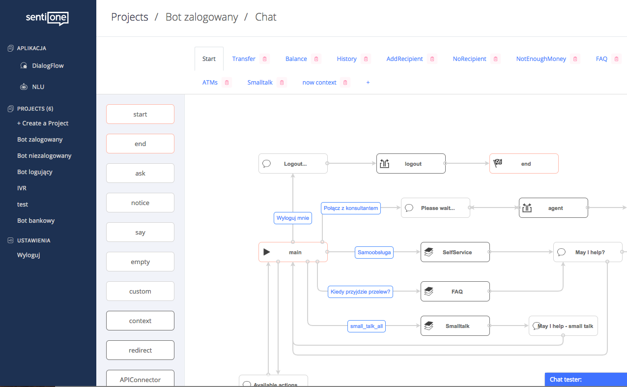 This is how our chatbots platform, where you can build possible client interaction scenarios from scratch, looks like now: