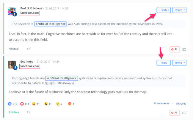 Przykładowy panel obsługi klienta w SentiOne React – strzałkami wyszczególnione są opcje odpowiedzi