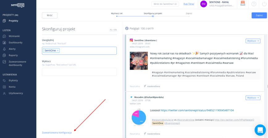 Na początku przygody z monitoringiem internetu nie każdy jest zaawansowanym użytkownikiem – dlatego w SentiOne dostępne są trzy podstawowe scenariusze projektów. Z czasem jednak wielu użytkowników wchodzi na coraz wyższy poziom – aby ułatwić im zmianę już stworzonego projektu na bardziej zaawansowany, wystarczy kliknąć “Zaawansowana konfiguracja”.