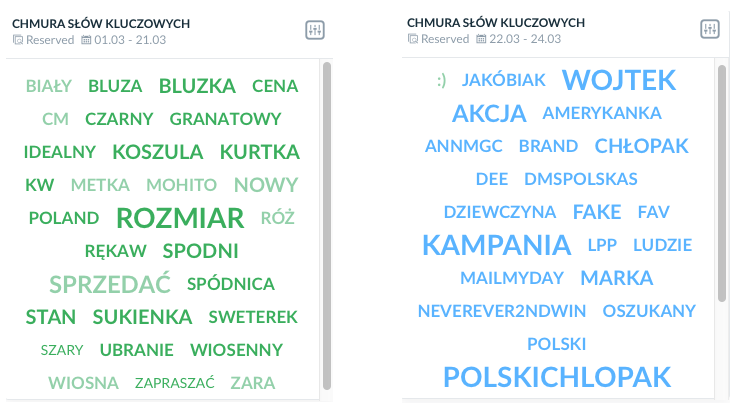I na koniec – chmura słów kluczowych, pojawiających się w kontekście Reserved przed revealem i od środy. Nie tylko nam kampania od razu skojarzyła się z performancem Jakóbiaka. Niestety dla marki, obok fraz “Wojtek” i “chłopak”, najczęściej znajduje się miejsce dla “fake” i “oszukany”. Widać też znaczną zmianę sentymentu w kontekście najczęściej padających słów.