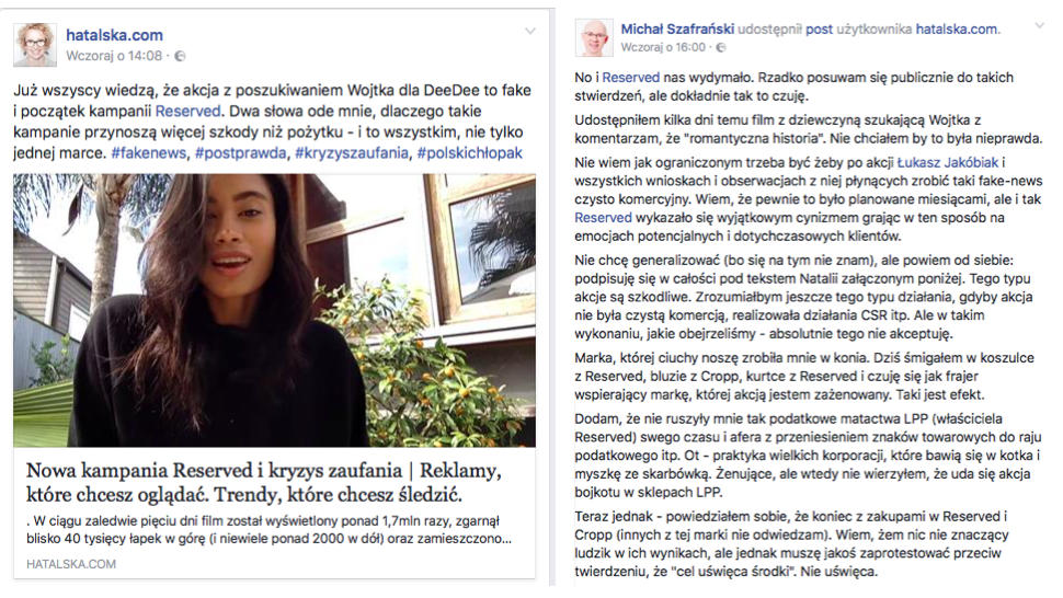 Bardziej sceptyczni powiedzą, że wynik tych działań pokażą excelowe tabelki z wynikami sprzedaży. Pytaniem pozostaje, jak na pieniądze przeliczyć spadek zaufania do marki. Na ten fakt zwracają uwagę między innymi czołowi influencerzy polskiej sieci, tacy, jak Natalia Hatalska i Michał Szafrański. Oni, podobnie, jak wiele osobistości internetu są całą akcję zniesmaczeni. A to na pewno Reserved nie pomoże.