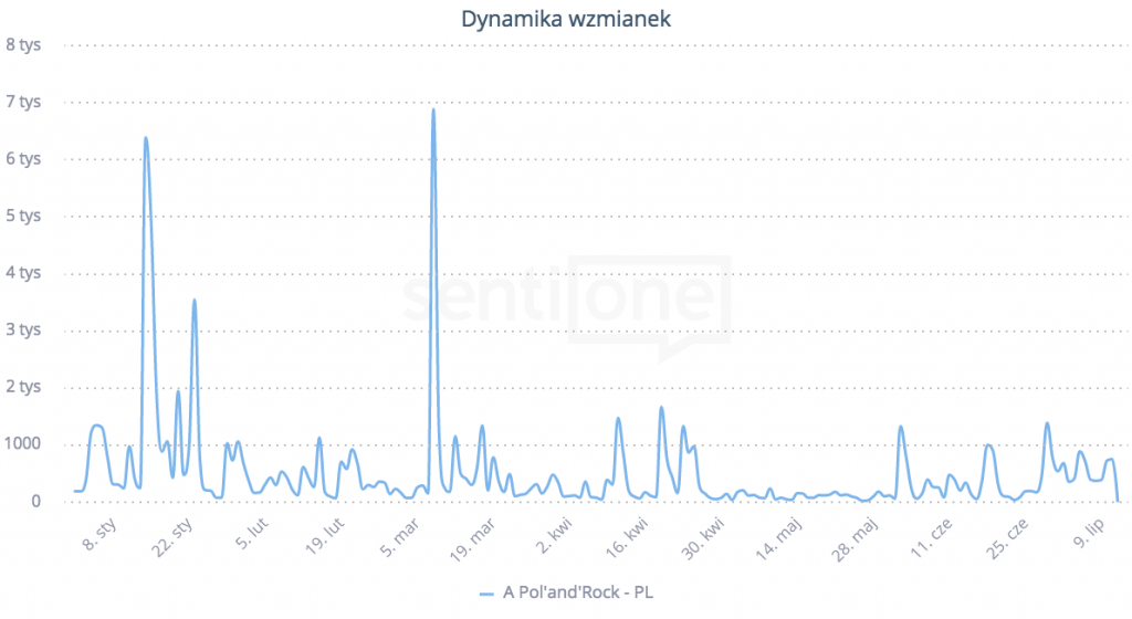 Dynamika wzmianek internautów nt. Pol’and’Rock Festiwal. Źródło: SentiOne